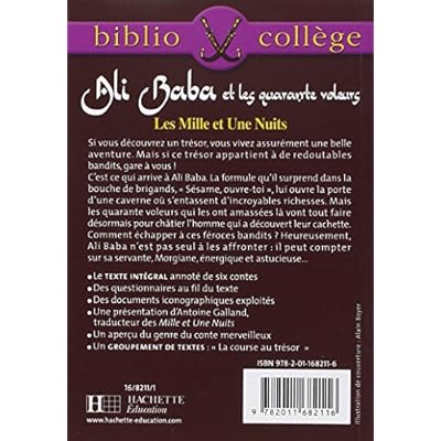 Si vous découvrez un trésor, vous vivez assurément une belle aventure. Mais si ce trésor appartient à de redoutables bandits, gare à vous !C'est ce qui arrive à Ali Baba. La formule qu'il surprend dans la bouche de brigands, « Sésame, ouvre toi », lui ouvre la porte d'une caverne où s'entassent d'incroyables richesses. Mais les quarante voleurs qui les ont amassées là vont tout faire désormais pour châtier l'homme qui a découvert leur cachette. Comment échapper à ces féroces bandits ? Heureusement, Ali Baba n'est pas seul à les affronter : il peut compter sur sa servante, Morgiane, énergique et astucieuse…Bibliocollège propose :• le texte intégral annoté de six contes: un fabuleux trésor, un oubli fatal, des funérailles discrètes, L’enquête des voleurs, L’échec de l’expédition, nouvel échec, un heureux dénouement,• des questionnaires au fil du texte,• des documents iconographiques exploités,• une présentation d'Antoine Galland, traducteur des Mille et Une Nuits, • un aperçu du genre du conte merveilleux.• un groupement de textes : « La course au trésor ».